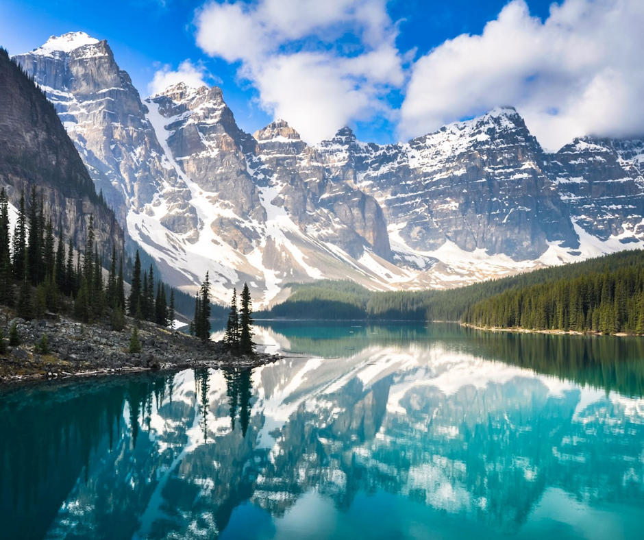prestigioso Lago Louise. Este lago é considerado um dos lugares mais espetaculares do mundo com suas águas azul-turquesa e sua magnífica vista da Geleira Victoria ao fundo. O passeio continua até o Lago Moraine e o Vale dos Dez Picos para ter acesso ao Parque Nacional Yoho e ao Lago Esmeralda. Retorno e hospedagem em Banff.