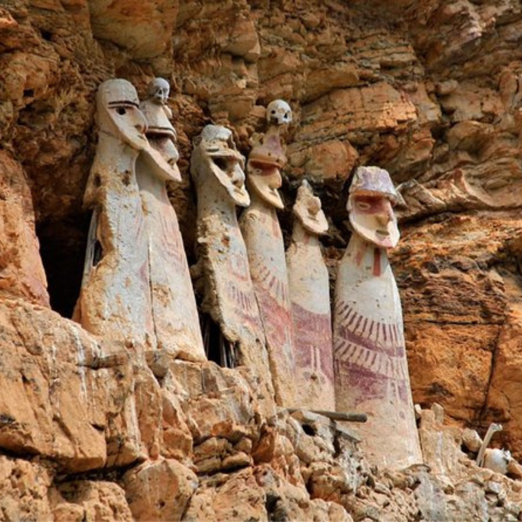 Saída ao povoado de San Bartolo, desde onde sairemos a pé por 2km até os mausoléus de Revash. Essas casas funerárias de até três andares, construídas nos penhascos íngremes, ainda preservam seus muros pintados em vermelho ocre e creme. Os mausoléus são observados a distância. Retorno a Leymebamba. Almoço. Dali, entraremos no Museu das Múmias da Lagoa dos Côndores. Em seus jardins foram plantadas mais de 100 variedades locais de orquídeas. Esse museu guarda uma valiosa coleção de quipus, antigo sistema de controle inca para a contabilidade das colheitas e dos animais. No armazém com clima controlado se guardam algumas das 240 múmias encontradas na Lagoa dos Côndores, que está no alto da região. Retorno a Chachapoyas. Hospedagem.